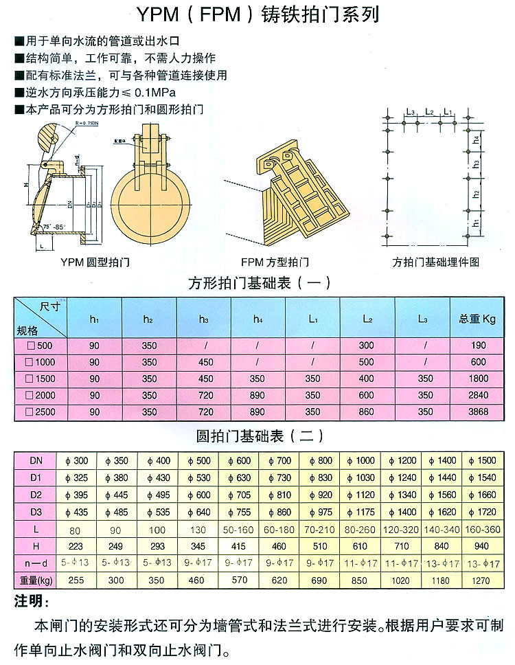拍門規(guī)格分圓形拍門和方形拍門兩種,可根據(jù)出水口大小形狀設(shè)計(jì)生產(chǎn);拍門類別可分別為空心浮板式拍門和平板式拍門。